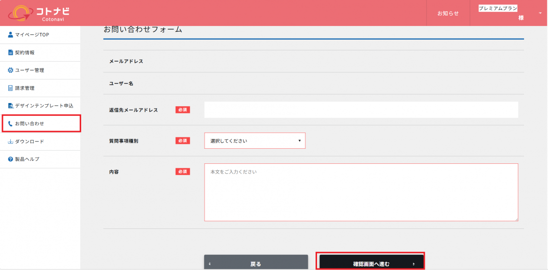 お問い合わせフォームに入力が終わったら「確認画面へ進む」をクリックし、入力内容の確認をしてください。