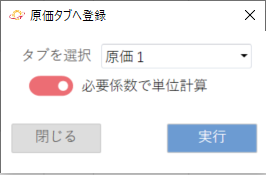反映する原価タブを選択できるので、原価1への反映を選択し、「必要係数で単位計算」にチェックを入れ、実行します。