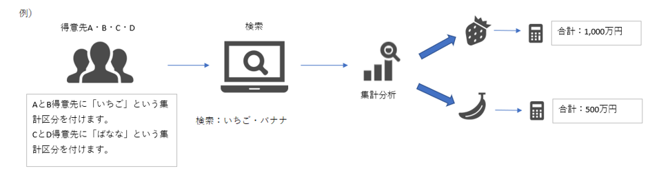 - 伝票ヘッダ集計区分1~4・・・集計区分マスタを参照し、そこから集計に必要なキーワードを設定できます。項目は「集計区分名称」で設定できます。