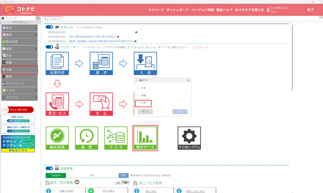 各台帳はメインメニューの「台帳管理」から開くことができます。