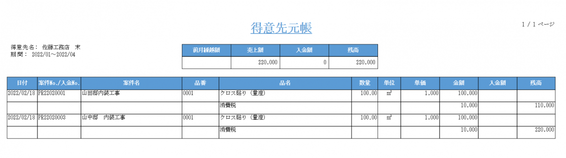 出力した元帳には、その得意先ごとの売上・入金情報が表示されます。