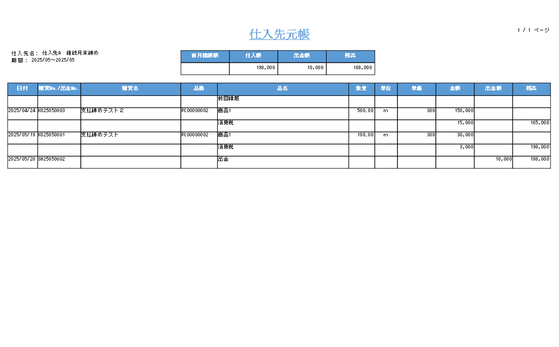 を指定することで、対象の得意先の明細単位の仕入先元帳をPDF形式で出力できます。