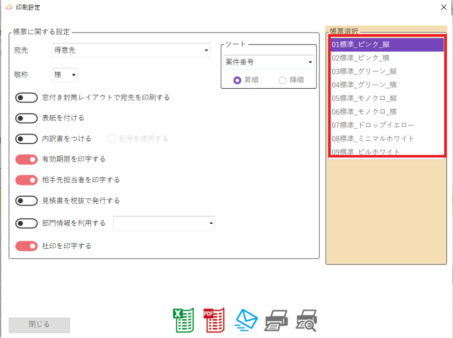「印刷設定」に表示されている「帳票選択」からご利用になりたい帳票を選択し、印刷を行ってください。