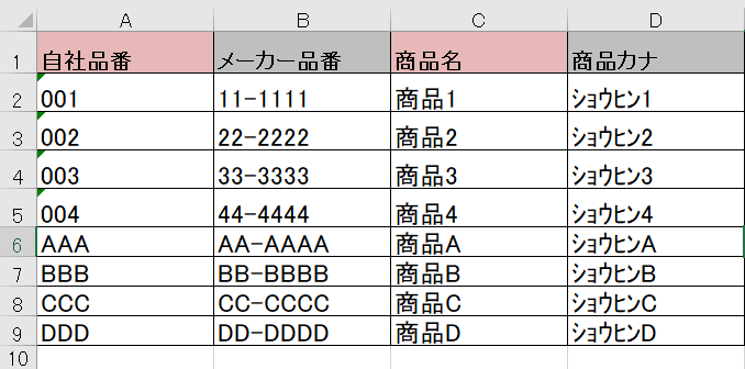 - A列「自社品番」(自社で設定する、商品の品番)