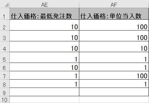 - AE列「仕入価格:最低発注数」(仕入を行なう際の最低発注数)