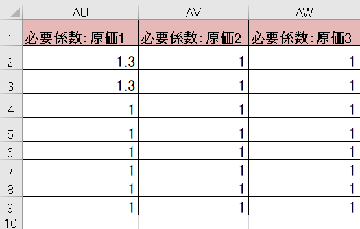 →この機能を使用しない場合は「1」を設定。 - AW列「必要係数:原価3」