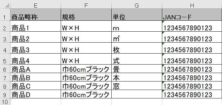 →初期はm/㎡/式/畳/枚/本/窓/台が登録可能。 - H列「JANコード」(商品のJANコード)