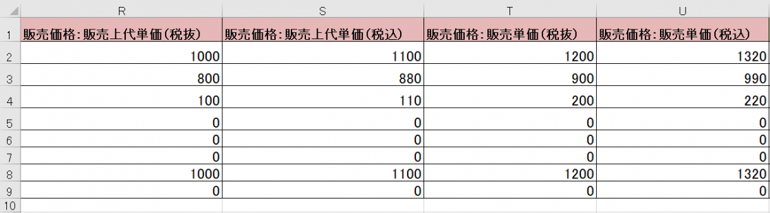 →使用しない場合、「0」を設定。 - U列「販売価格:販売単価(税込)」