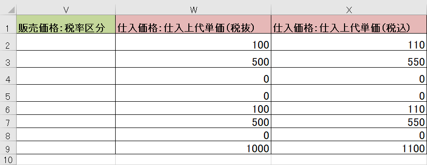 - V列「販売価格:税率区分」