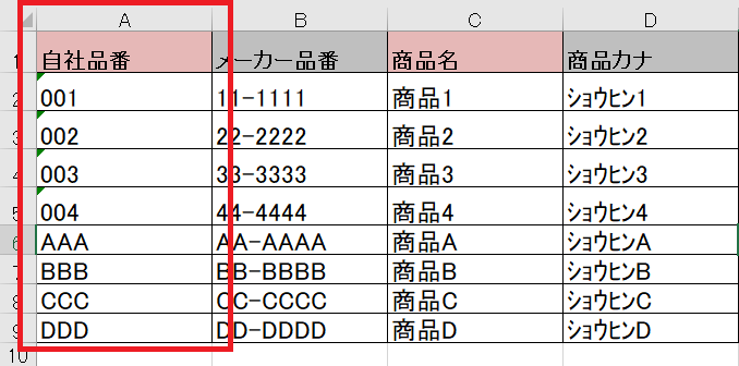 A列「自社品番」(自社で設定する、商品の品番)