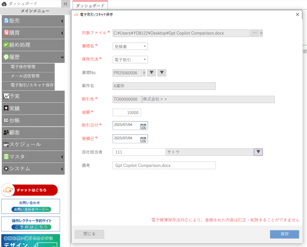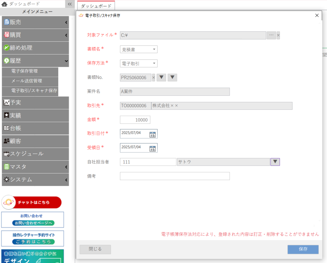 - 電子帳簿保存法対応により、登録したデータは7年間訂正、削除することができません。