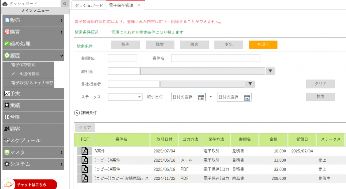 保存を行うことで「履歴管理」メニューの「電子保存管理」で「全項目」を検索した際に、登録したデータが表示されます。