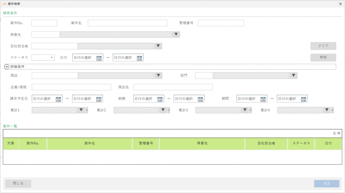 - 集計名称1~4・・・システム設定の「集計名称設定」の「案件・購買関連集計名称」で登録した名称が表示されます。それぞれの項目で検索画面を表示することで、事前に「集計区分名称」で登録した顧客の業態を引用します。