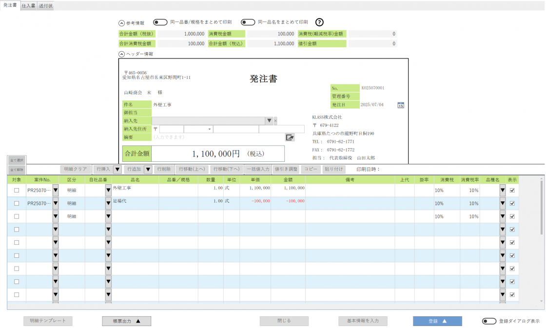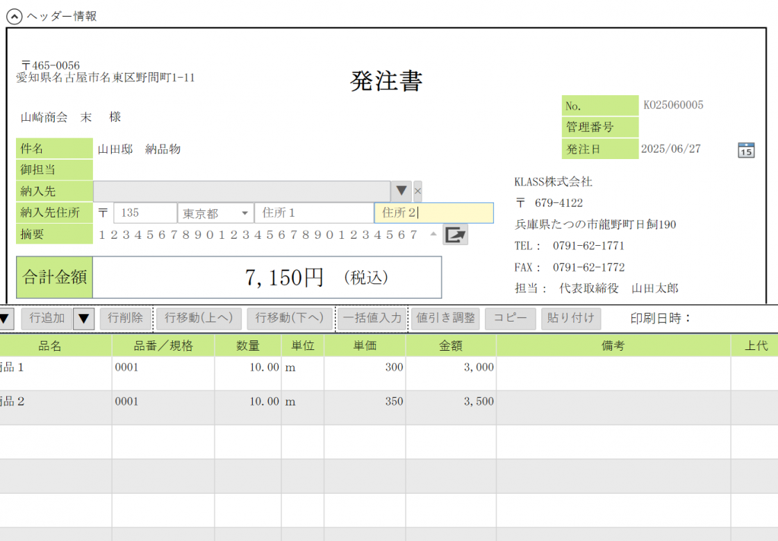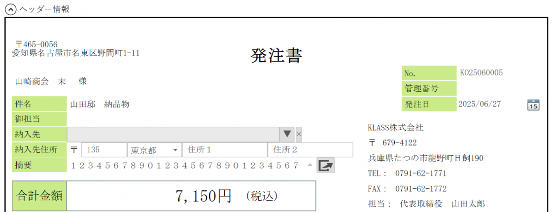 その際、伝票内の仕入先住所や仕入先担当者、会社情報などは登録した基本情報から自動で引用されます。