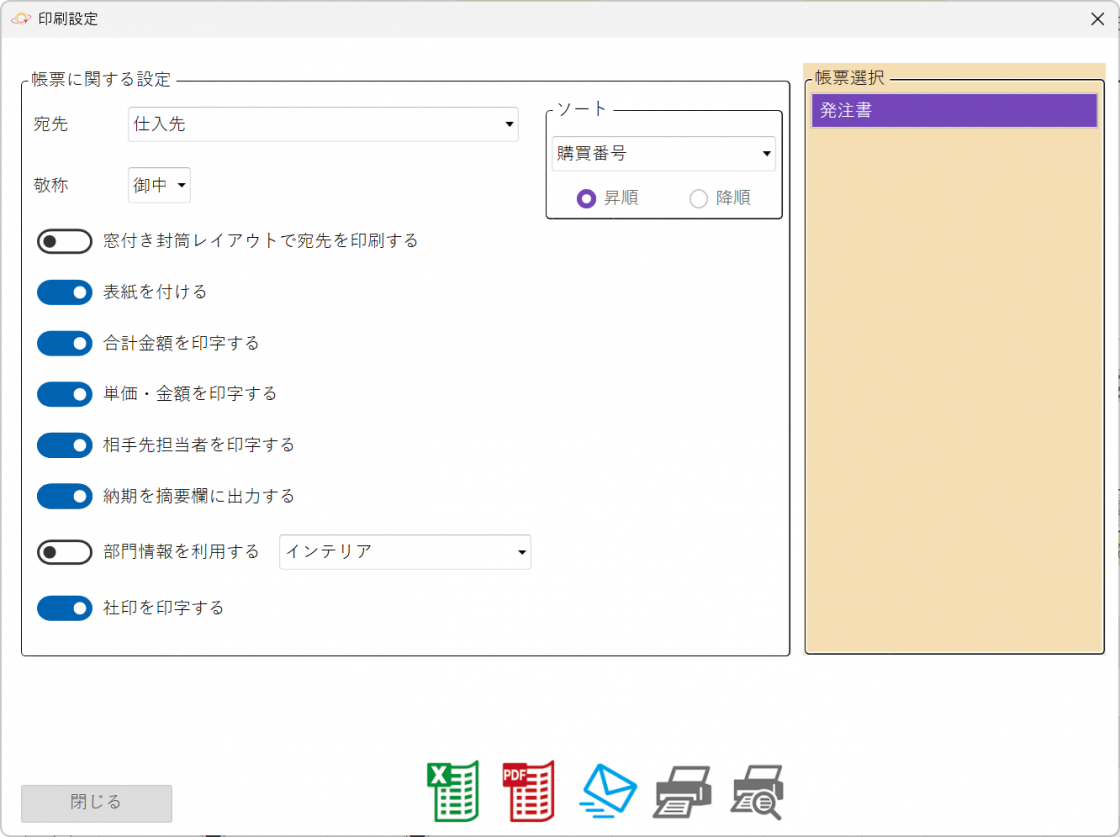 「購買番号」「発注日」のどちらかを基準に昇順、降順で並び替えることができます。 - 窓付き封筒レイアウトで宛先を印刷する