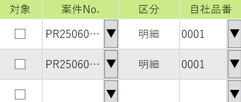 - 案件No.・・・その明細行の発注(仕入)の元になった案件の案件No.が設定できます。「案件から発注作成」を使用して明細を登録した場合は自動的に設定されます。