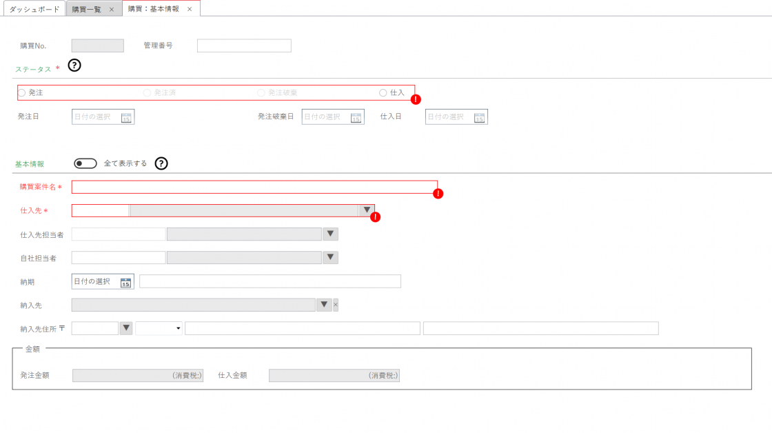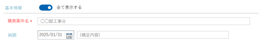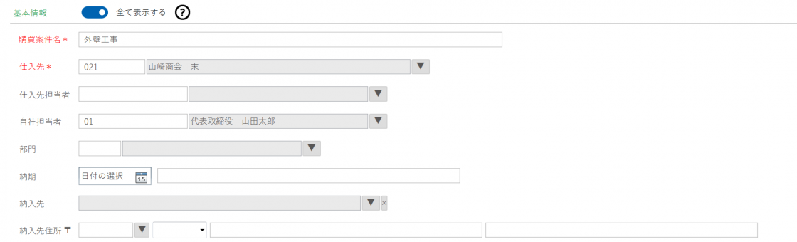 基本情報を開いた時点では表示される項目はオプション設定の購買管理ー基本情報表示設定で設定したものになっていますが、「全て表示する」をONにすることで非表示にしている項目もすべて表示できます。