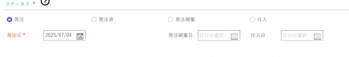 - 仕入・・・案件が「仕入」になった際に設定します。その際、「仕入日」と「支払予定日」を設定します。