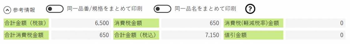 明細内の「値引」金額の合計を表示します。 - 同一品番/規格をまとめて印刷
