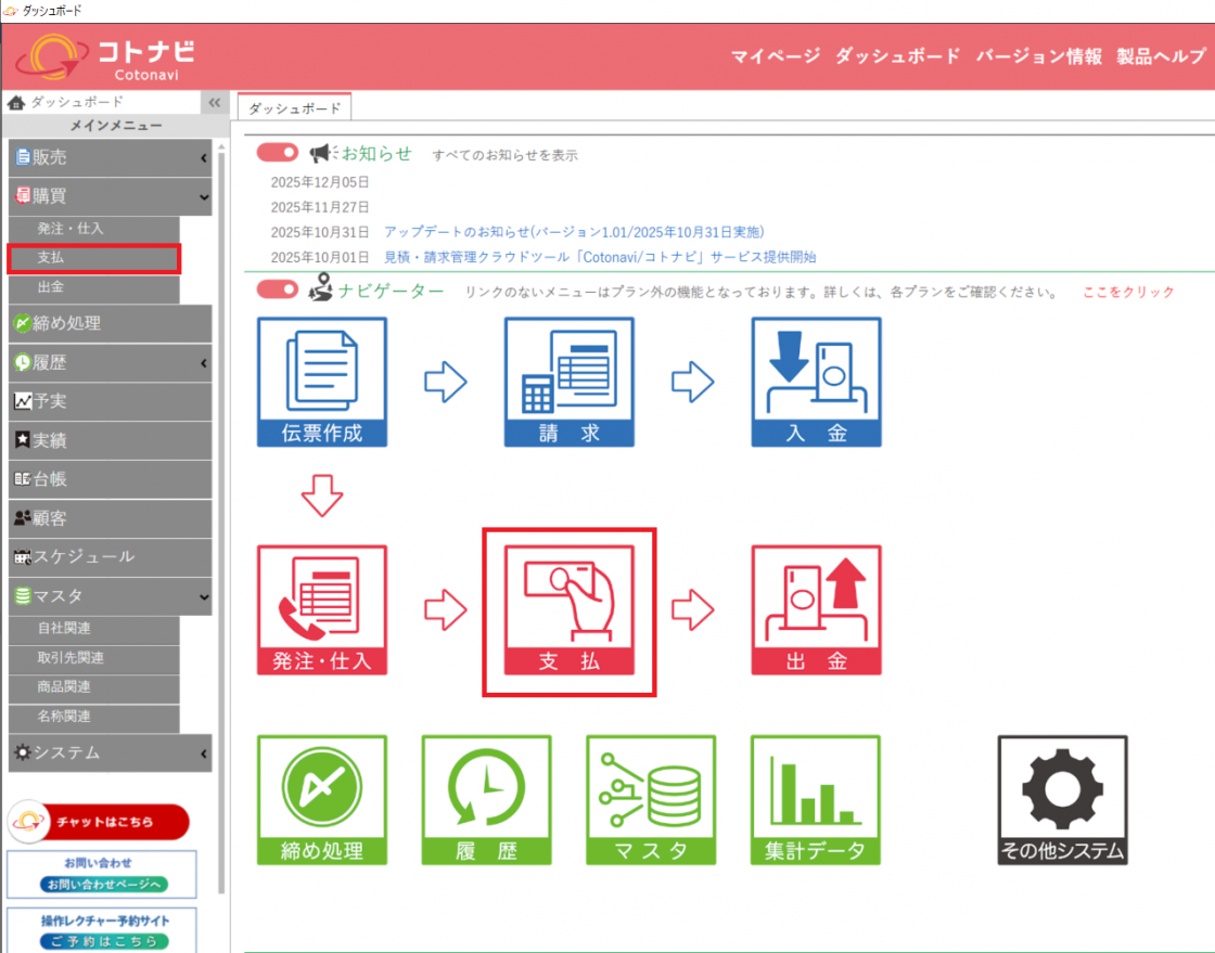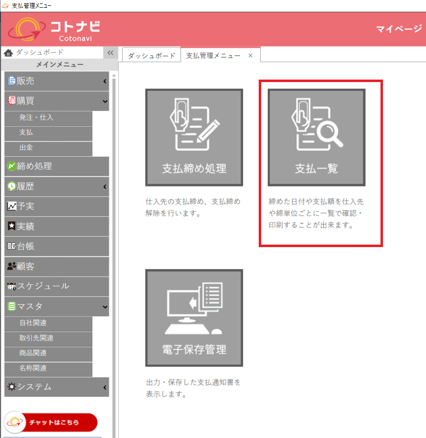 支払状況の一覧での確認、支払通知書の発行はメインメニュー、もしくはダッシュボードの支払から開くことができます。