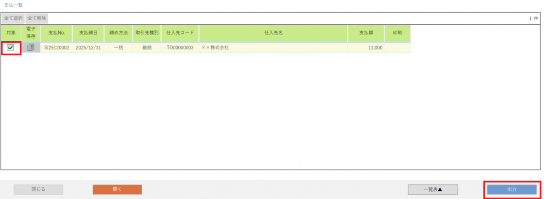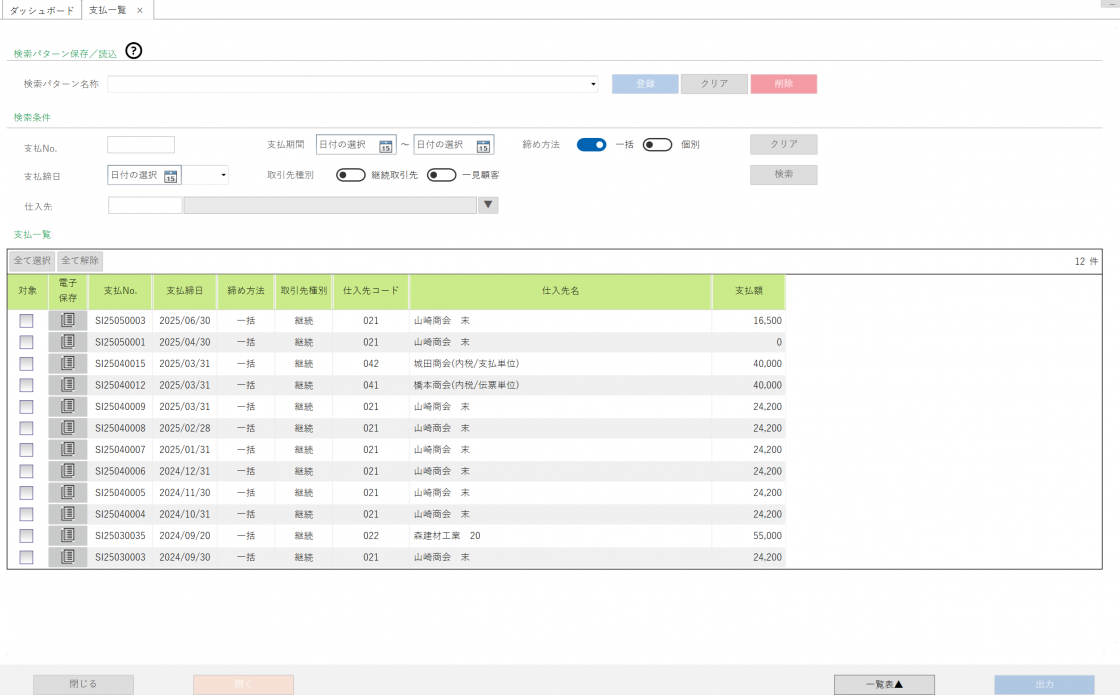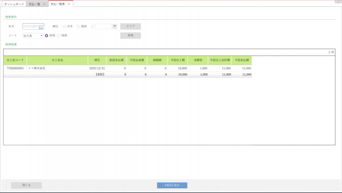 締め作業を行なった仕入先の支払が一覧で表示されます。