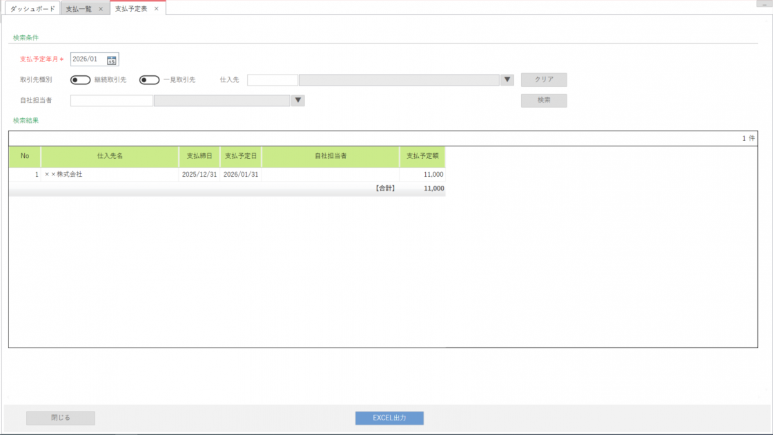 「支払一覧表」「支払予定表」で絞り込んだ検索結果は「Excel出力」をクリックすることでExcel形式でデータを出力することができます。