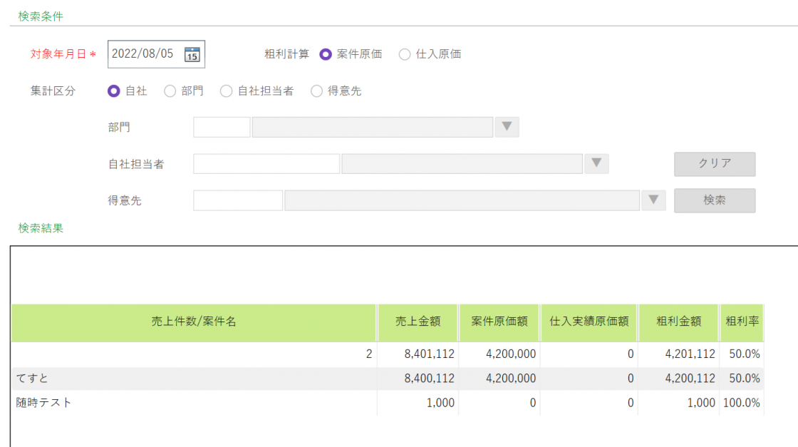 ステータスが「売上」か「請求済」になっている案件の実績が月報形式で表示されます。