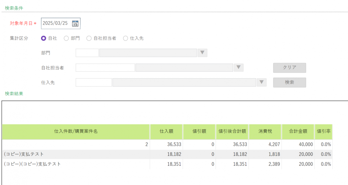 - 集計区分(自社/部門/自社担当者/仕入先)
