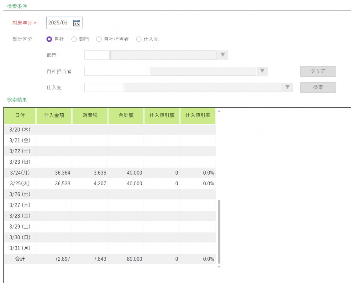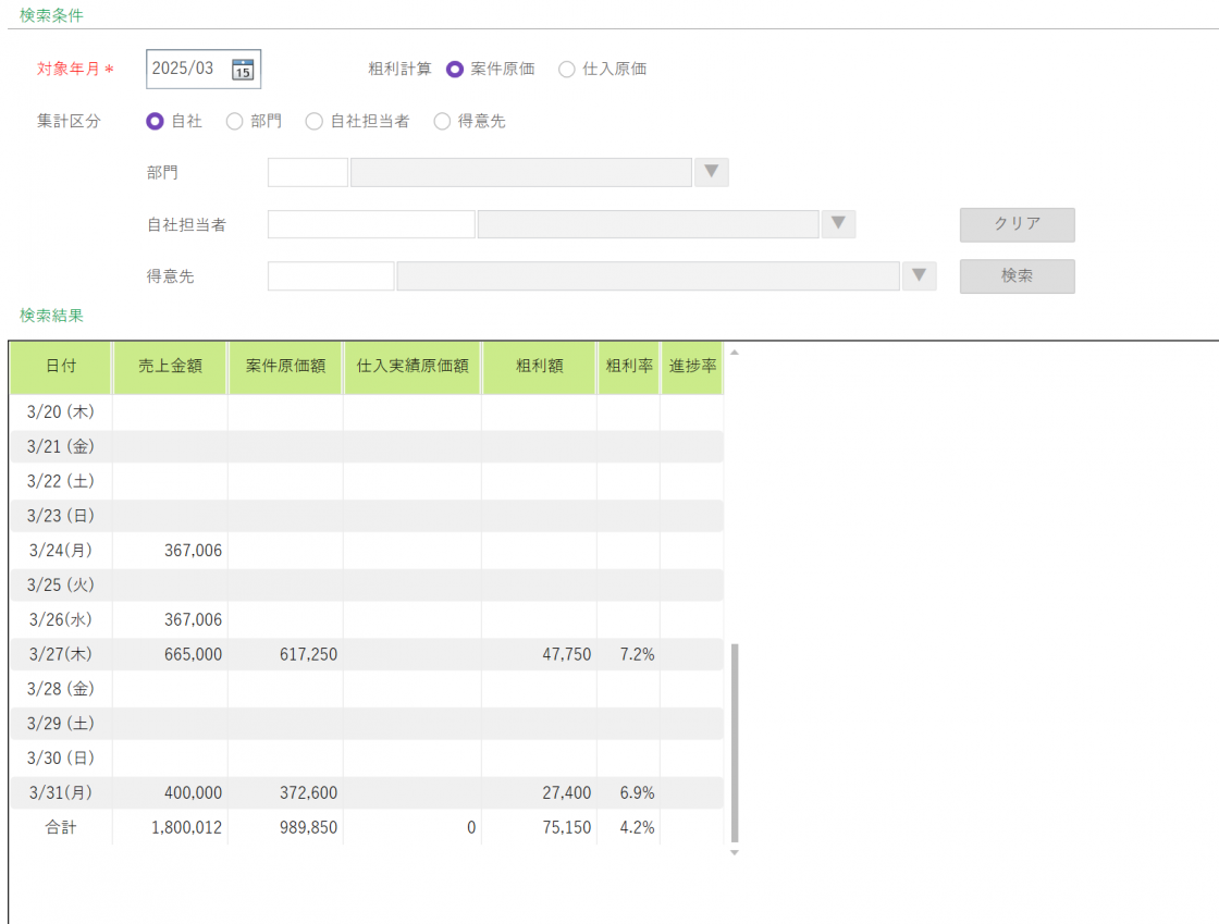 ステータスが「仕入」になっている購買案件の実績が日報形式で表示されます。