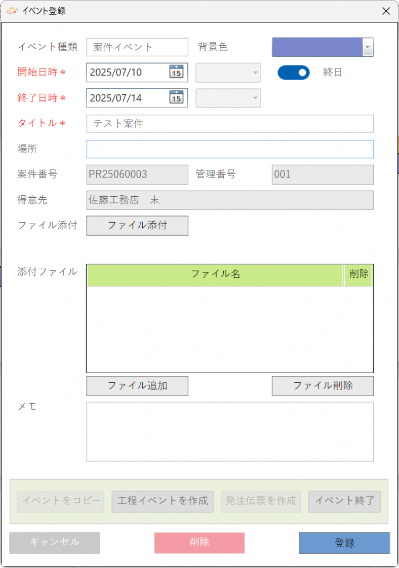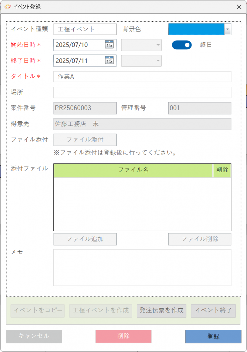 「工程イベント」では、「案件イベント」同様、元の案件の登録情報の一部が反映されます。
